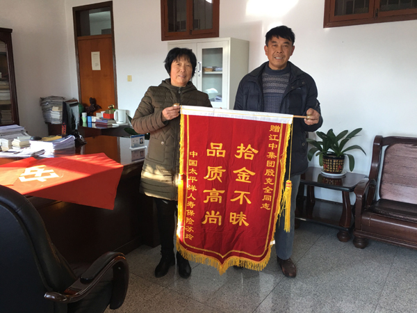 2017年12月25日上午,為了感謝拾金不昧好同志---殷克權,失主蘇玲送來了錦旗。蘇玲說:雖然我和殷師傅素不相識,但我感受到了淳樸善良的完美心靈,相信好人有好報,我們也會把他的這種拾金不昧的精神和這股正能量繼續傳遞下去,再次說聲多謝!他的善舉給我們保險公司和我家人上了很生動的一課。