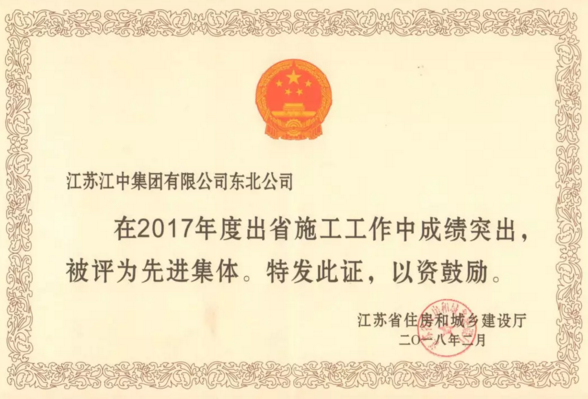【聚焦江中】集團東北公司榮獲“2017年度江蘇省出省施工先進集體”