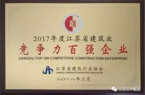 江中集團連續榮獲“江蘇建筑業企業競爭力百強企業”榮譽稱號。