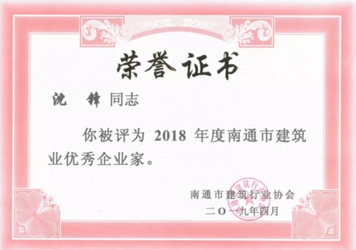 江蘇江中集團榮獲南通建筑業競爭力三十強企業稱號;集團總裁沈鋒榮獲2018年度南通市建筑業優秀企業家稱號并當選南通建筑業協會副會長。