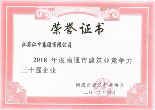 南通市建筑業競爭力三十強企業按競爭力指數總分值排名。競爭力指數評價共分經營規模、資產規模、盈利能力、上繳稅金、員工構成、科技進步、管理水平、精神文明等8項分類指標和全年營業收入合計、建筑業總產值、在境外完成營業額等細化指標。江蘇江中集團獲評此獎項充分說明了集團的企業綜合實力和2018年度取得的驕人經營成績。