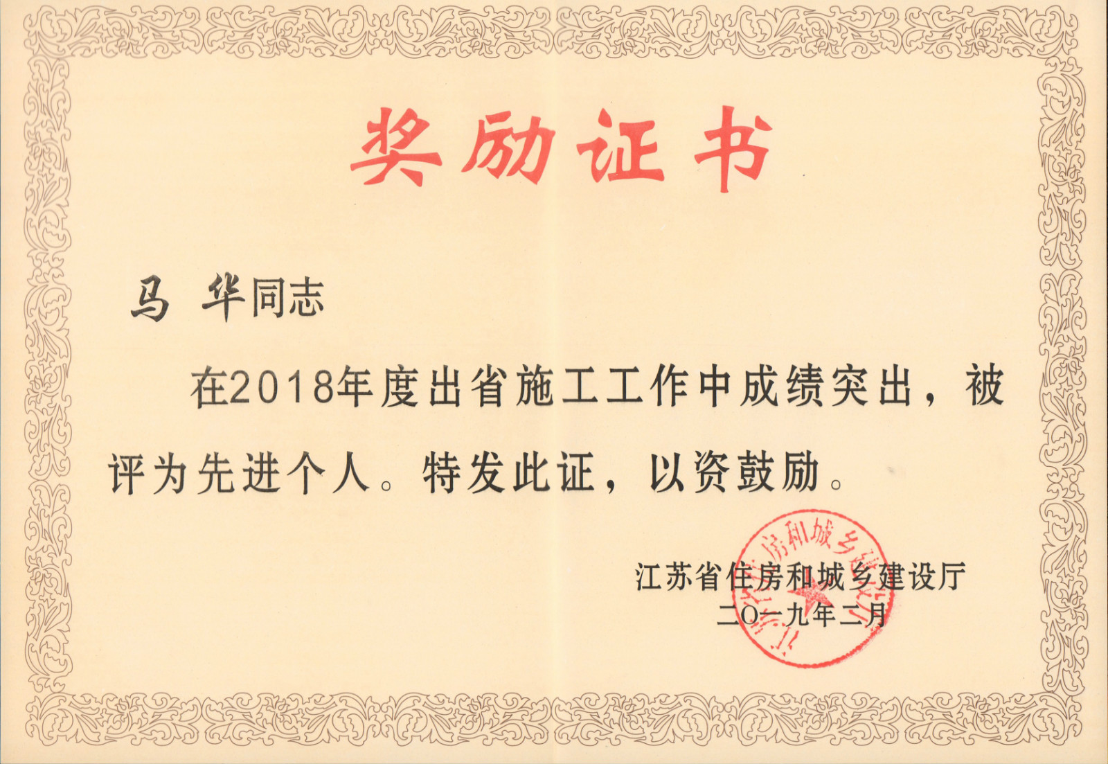 東北公司榮獲了2018年江蘇省出省施工先進集體”稱號。馬華、沈克慧等三名同志被評為“2018年江蘇省出省施工先進個人” 稱號。