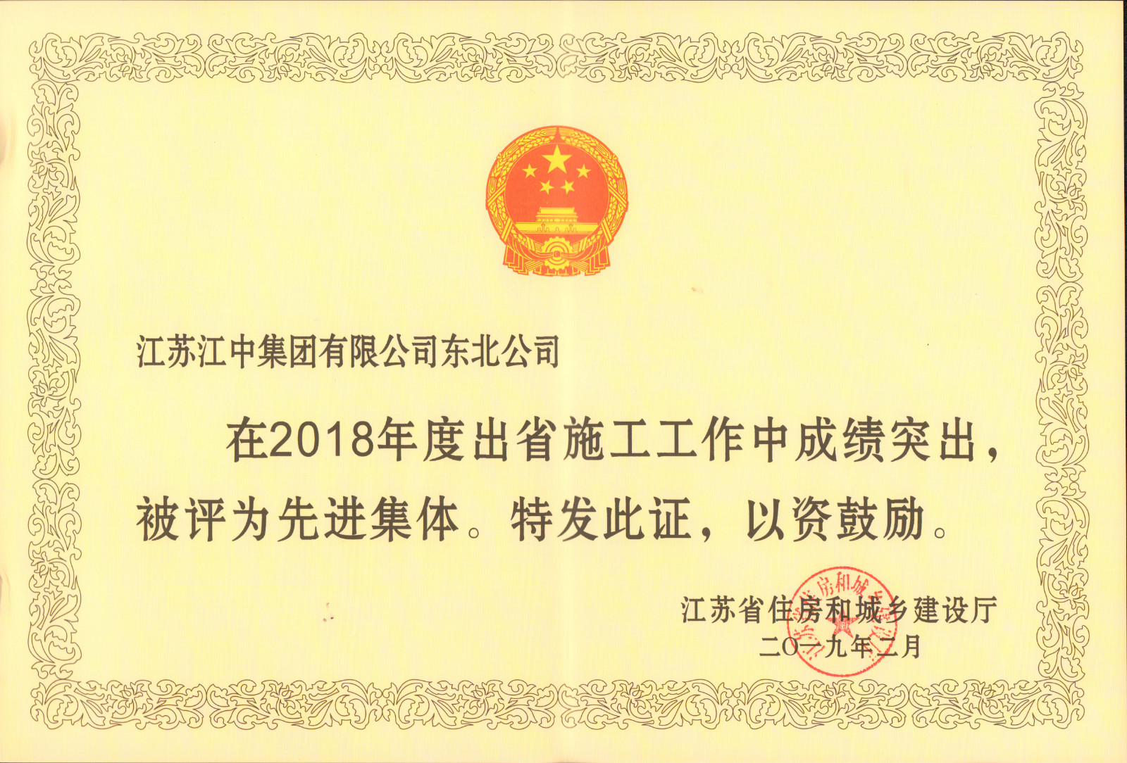 江中集團東北公司被評為“2018年江蘇省出省施工先進集體”