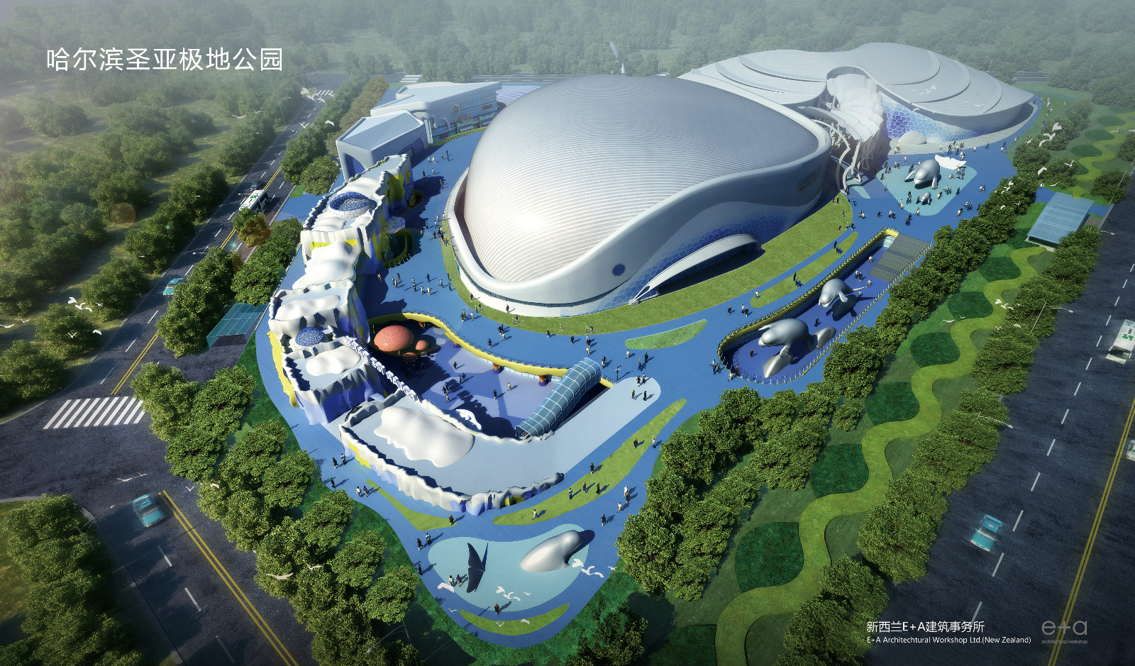 極地公園項目聘請了國際頂尖設計團隊,由新西蘭e a進行項目規劃設計,將一期建筑與二期建筑有機結合成栩栩如生的“大白鯨”造型,與哈爾濱大劇院形成兩大特色地標,動靜結合,相互呼應;由美國著名魔幻大師弗朗茲·哈拉利(世界魔術史上第一位集設計、制作和表演于一身的魔幻大師)進行奇幻秀設計;由日本綜合環境設計專家宮島修二先生進行景觀設計。